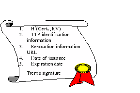 The second element of the PPAT is identification information of Trent. The third element of the PPAT is a Uniform Resource Locator [LEE98] pointing to Trent's PPAT revocation status service. PPATs get revoked when the respective user certificates are revoked. The fourth and the fifth element refer to the date and time of issuance of the PPAT, as well as its expiration date and time. This must be equal to the expiration date of the respective digital certificate Alice has obtained from Trent.